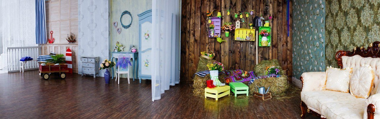 Для тех, кто ни разу не был в фотостудии, поясню, что семейная фотостудия обыкновенно представляет собой большой зал, поделённый на зоны. Они отличаются по цвету и смысловому содержанию - так, в одной зоне может быть расположена ярко-зелёная клумба с цветами, а в другой стоять винтажный диван, колыбелька и мягкое кресло: